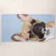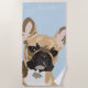 Personalised pop art french bulldog beach towel featuring a cute red fawn frenchie on a pastel blue background that can be changed to any colour, and your name.
