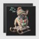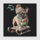 French Bulldog goes sledding in the snow. This winter vacation seems perfect. With a pompom hat, scarf, and warm clothing, the little dog's sled ride begins in the mountains. Snow fell on this vacation just in time for Christmas. A dreamily funny motif of a small bulldog.