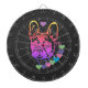 Cute little French bulldog with many colorful hearts as a collar. The modern neon colors shine beautifully. Great dog head with a loyal expression.