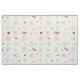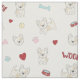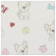 This modern fabric for dog lovers feature a fun print of cute Frenchies (french bulldogs) with pink and light blue pawprints and dog bones, red hearts and food bowls, and yellow tennis balls.