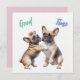 Adorable French Bulldogs are very much in love. The Bully lady has colorful hair accessories and draws all the attention. Very beautiful and funny illustration of two great dogs. The Bully jumps up on his friend and definitely wants to play. A great gift for any animal lover. Bulldogs love adventure and enjoy time with people and animals.