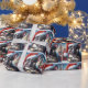 A black and white Frenchie is wearing a red cap while Christmas lights twinkle in the background.