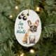 On the front of this Holiday ornament is an image of an adorable brown and white French Bulldog sitting in front of a gold confetti background. Black and gold tree bulb ornaments hang at the left side. Green text says "Joy to the World". The back of the ornament has the same confetti background and text fields for you to personalise each ornament, or just blank out the text if you prefer.