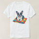 This eye-catching t-shirt design features a beautifully detailed French Bulldog illustration in classic black and white colouring, resting comfortably on a cheerful patchwork cushion. The Frenchie is rendered with stunning realism, capturing the breed's distinctive bat ears, expressive brown eyes, and endearing facial features. The colourful cushion beneath the dog showcases a vibrant geometric pattern in teal, coral red, and yellow, creating a perfect contrast with the dog's monochromatic colouring. The detailed shading and texturing bring both the dog and cushion to life, making this design pop on any shirt colour.