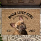 French Bulldog Personalised Dog lover welcome doormat. This welcome mat can be personalised with your dog’s name, the slogan can also be changed or you could use a picture of your own dog (make sure it's transparent). Text reads: Bodie lives here…. All treats welcome