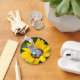 This colourful keychain features a cute grey, blue, French Bulldog puppy, sitting in a giant yellow sunflower.