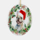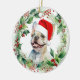 Here's an adorable personalised ornament for anyone who loves a French Bulldog. The front image is of a cute Frenchie puppy wearing a red and white Santa Claus hat. The dog sits within a pretty holly and red berry Christmas wreath. The back of the ornament has the same wreath image with your custom text in green and red.