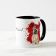A beautiful water colour portrait of a French Bulldog stands out against a bright red abstract paint splatter background. The image is on two sides of the mug, with your name or other custom text in black between them.