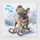 French Bulldog takes a sleigh ride in the snow. With a beanie, scarf and warm clothes, the little dog starts sledding in the mountains. Finally snow for Christmas, the little Frenchie is thrilled.