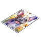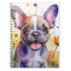A digital art image of a French Bulldog with a playful expression, surrounded by vibrant and colourful flowers. The background features splashes of bright colours, giving the scene a lively and energetic feel.