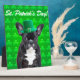 Cute French Bulldog with St. Patrick Hat and clovers background.