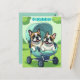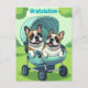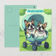 Funny French Bulldogs sit together in a green stroller. The little dogs are very cute with their sweet faces, they look like twins. The adorable French Bulldog in the stroller is in the middle of the forest on a green meadow. Maybe the Frenchies are waiting for their mother? A beautiful, funny motif for every animal lover. The Frenchie is a small molosser, very agile, athletic, and lively. He is a clown among dog breeds and extremely lovable. The Bully is very fond of children and a loyal family dog. Due to its size, it is also easy to keep in an apartment, and of course, it loves its regular walk.