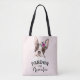 This fun tote bag has a cute brown and white watercolor French Bulldog with a small bouquet of purple, peach, and green watercolor flowers and leaves sitting on her forehead. The customisable text says "Pardon my Frenchie".