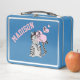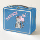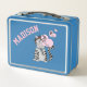 A cute blue lunch box for kids (boys or girls) with a grey and black tabby cat sending hugs and kisses . Use the template to personalise it with your child's name . Feel free to change the colour of the font or the font itself if you wish to .