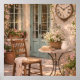 Bring the warmth and romance of the French countryside into your home with this serene courtyard wall art. A rustic stone table set with an open book, fresh coffee, and delicate flowers sits beside a charming wooden chair draped with a soft linen throw. Sunlight glows through vintage French doors adorned with a lavender wreath, while climbing roses and an antique hanging clock complete the tranquil garden scene. Perfect for farmhouse kitchens, cosy reading corners, cottage interiors, and French country décor.