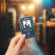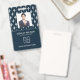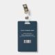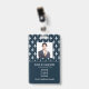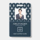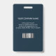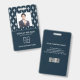 Modern photo business ID identification card with bar code over white french damask pattern on blue. Additional information can be added to the backside of this business ID badge