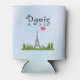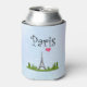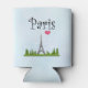 A can cooler with a whimsical drawing of the Eiffel Tower surrounded by green trees and pink watercolor heart floating in the air.