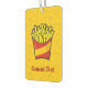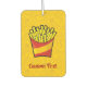 Cartoon illustration of small pack of french fries. Junk food outline icons yellow pattern background. Custom text on both sides.