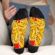 Funny cartoon socks featuring French fries splashed with red ketchup.