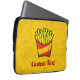 Cartoon illustration of small pack of french fries on yellow junk food seamless background. Custom text.