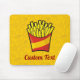 Cartoon illustration of small pack of french fries on yellow junk food seamless background. Custom text.