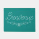 Beautiful and trendy French language home welcome mats with the word welcome expressed in a stylish lettering with floral motif accent graphic and teal coloured background colour you can change if you prefer another backdrop colour. Designed to welcome guests and visitors to your home or business.