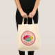A grocery tote featuring an illustration of four French macarons (purple, blue, pink, and yellow) inside a decorative pink and blue circle with pink text that says "Merci Beaucoup" and "Thank You."