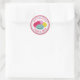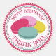An envelope seal sticker featuring an illustration of three French macarons (pink, blue, and yellow) inside a decorative pink and blue circle with pink text "Merci Beaucoup" and "Thank You."