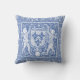 Elegant blue and white pillow with cherubs carrying a coat of arms with three fleur de lys. From a mediaeval embroidery or tapestry pattern.