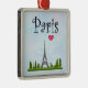 An ornament with a whimsical drawing of the Eiffel Tower surrounded by green trees and pink watercolor heart floating in the air. Light blue digital watercolor background.