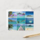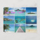 Postcard with a collage of multiple images of the beaches of the Pacific islands of French Polynesia, like Tahiti, Moorea, Bora Bora and Rangiroa with the pink text: 'Love from Tahiti'.
