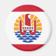 The flag of French Polynesia was adopted in 1984. Two red horizontal bands encase a wide white band; centred on the white band is a disc with a blue and white wave pattern depicting the sea on the lower half and a gold and white ray pattern depicting the sun on the upper half; a Polynesian canoe rides on the wave pattern; the canoe has a crew of five represented by five stars that symbolise the five island groups; red and white are traditional Polynesian colours.
