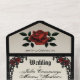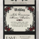 Stunning and Elegant look of iron fencing frames and dark red roses on a antique gold invitation with unique script. The RSVP return has two candelabra and custom deliver to text. Change the text for what you need. If you need any help just message me.