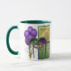 Reminiscent of scenes from the French Quarter in New Orleans, here is a white and hunter green 11 oz. ringer combo mug with an image, on both sides, of purple balloons, a gold star balloon weight, green and gold squares, a gorgeous green and purple sequin mask, and a silhouette of a female dancer. See matching candy jar, espresso cup, flask, pitcher, shot glass, teapot and coasters. See the entire Mardi Gras Mug collection in the FOOD/BEV | Dishes section.