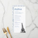French Toile Bat Mitzvah Eiffel Tower Elegant dinner reception menu with the option to fully customise all titles and text. The front is black and white with an Eiffel Tower photo and the back features a dainty blue French Floral design and personalised name and event text. Enter the Zazzle Design Tool for additional design.