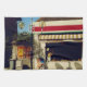 The flavour of France is captured in the original photograph by ZoeSPEAK on this Kitchen Towel. Taken in the town of Hourtin, in the wine country of the Medoc, the photo shows the village bakery in the afternoon sun. The shadow of an old fashioned street lamp stretches across the sidewalk onto the wall below the display window. Over the window is a striped awning with the words "PATISSERIE" AND "PAIN" ("pastry" and "bread"), and a bold red stripe across the cream coloured building. An old circus poster and a placard for ice cream bars add colour to the scene. Leafy green vines climb over the stone wall on the side of the shop, throwing their shadows across the walls. Part of a taller building in shadow, a walkway and blue sky complete the picture. The photo was taken in 2002.