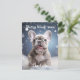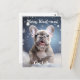 A charming postcard that captures the pure joy of the holiday season. The front of the card features an adorable French Bulldog puppy, frolicking with boundless enthusiasm in a snowy landscape. The pup's infectious happiness is evident, with snowflakes gently falling around, creating a serene and festive atmosphere.