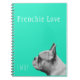 NewparkLane - Norebook, with a black and white watercolor Frenchie, with quote 'Frenchie Love', against a bright teal / aqua colored background, and a template for your name. Easy to customize in Zazzle with your own text for a personalized design. All text style, colors & sizes can be modified to fit your needs. A cute gift for any French Bulldog lover! Do you have specific personal design wishes? Or do you want this design on a product not currently in this collection? Feel free to contact me, and I will happily make it for you free of extra charge!