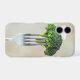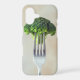 A vibrant piece of fresh broccoli pierced on the prongs of a fork, set against a softly blurred background.
