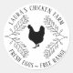 Clean product classic round sticker label for egg cartel showing fresh and custom appeal for chicken egg sellers. Country chicken farm organic eggs.