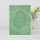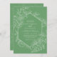 Elegant colour and geometric design make this invitation stunning. This design features a fresh green background, a lovely floral botanical line drawn sketch, and custom typography with a geometric border on the front. The reverse side features a lovely floral tapestry.