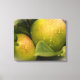 A delightful photograph of a pair of apples still on the tree, nestled amongst their green leaves. Water droplets cover their skin giving these apples a fresh crisp appearance. The apples are ripening and have a nice mixture of shades ranging from bright green to orange and red.