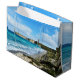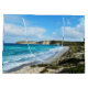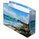 Pictured is a long view of aqua blue sea waters breaking onto white sand with views of high cliffs and lush vegetation