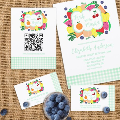 She's off the market! Bridal shower featuring hand drawn fruits and veggies with a mint green gingham accent