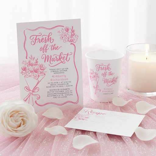 Pink whimsical floral hand-drawn bridal shower paper plates "Fresh off the Market"