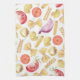 Fresh Pasta & Tomatos Mix kitchen towel design features watercolor illustration of delicious pasta varieties, including Farfalle, Fusilli, Orecchiette, Conchiglie, Penne tossed with ripe tomatoes and shallots.