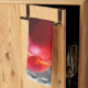 The image on this Kitchen Towel is an original photograph by ZoeSPEAK of a fresh peach, in all its glorious shades of reds, pinks and yellows. The fruit is resting on a light aqua blue plate which has a relief design of a whole peach with a leaf, and a peach slice. The border of the china plate has a basket-weave pattern. Sunlight shines on the top of the peach, adding a rosy glow to the background and the entire photo.