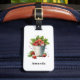 A luggage tag with a summery graphic of a bunch of strawberries overflowing in a bucket.