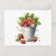 A postcard with a summery graphic of a bunch of strawberries overflowing in a bucket.