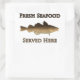 This logo includes the captions "fresh seafood" and "served here" along with an Atlantic cod illustration. The Atlantic cod is an icon of commercial fishing communities around the world. Atlantic cod are marketed by sizes; small individuals are called scrod while the largest are called cows.